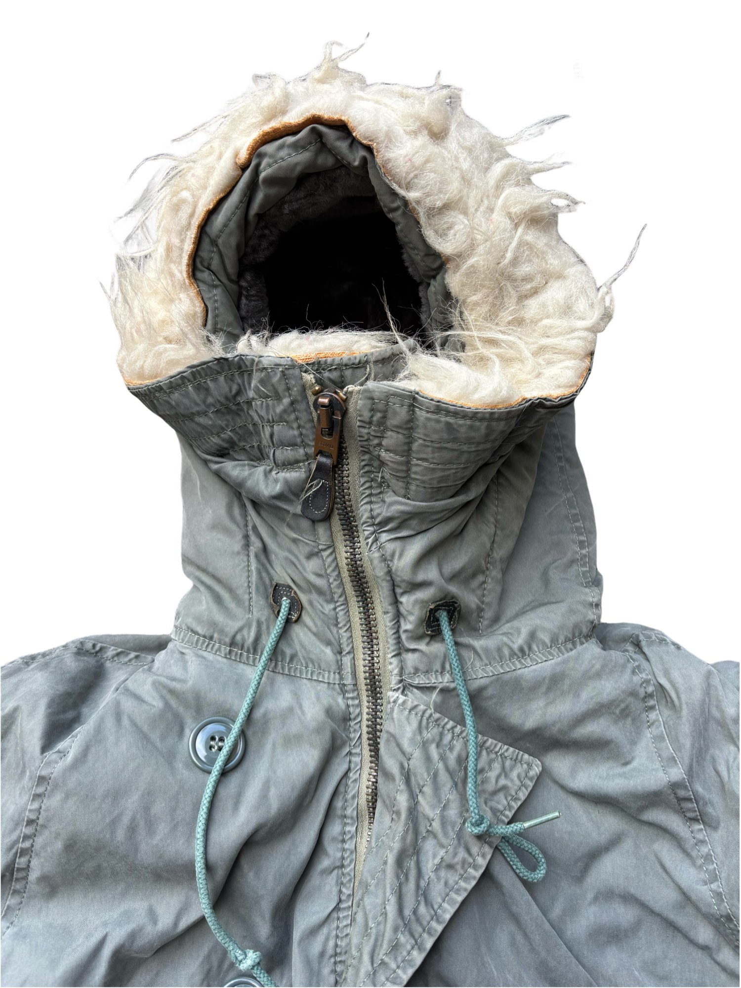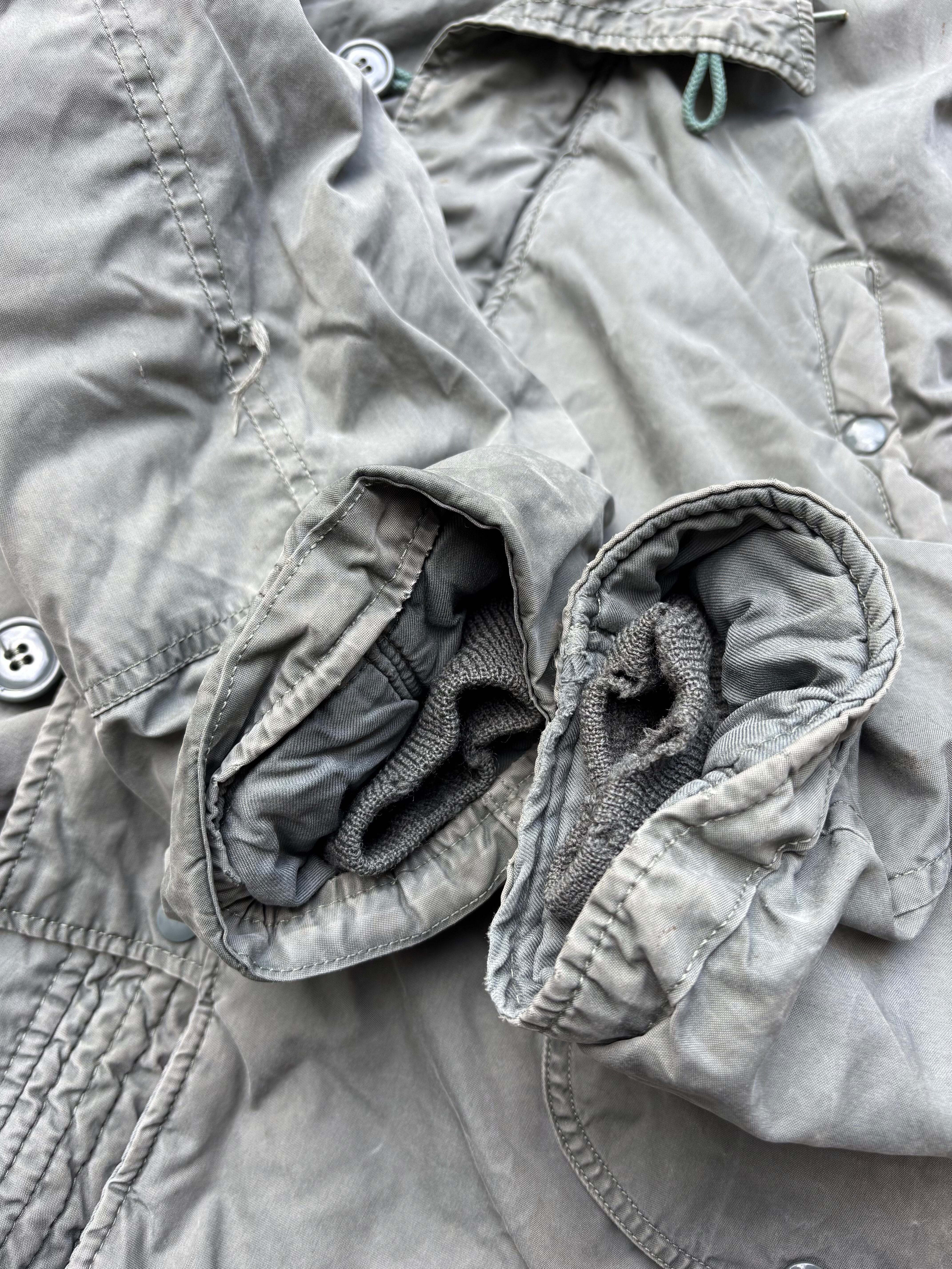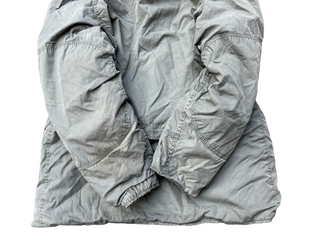 程度は袖リブに穴、右袖に引っかきキズと薄汚れがあります。