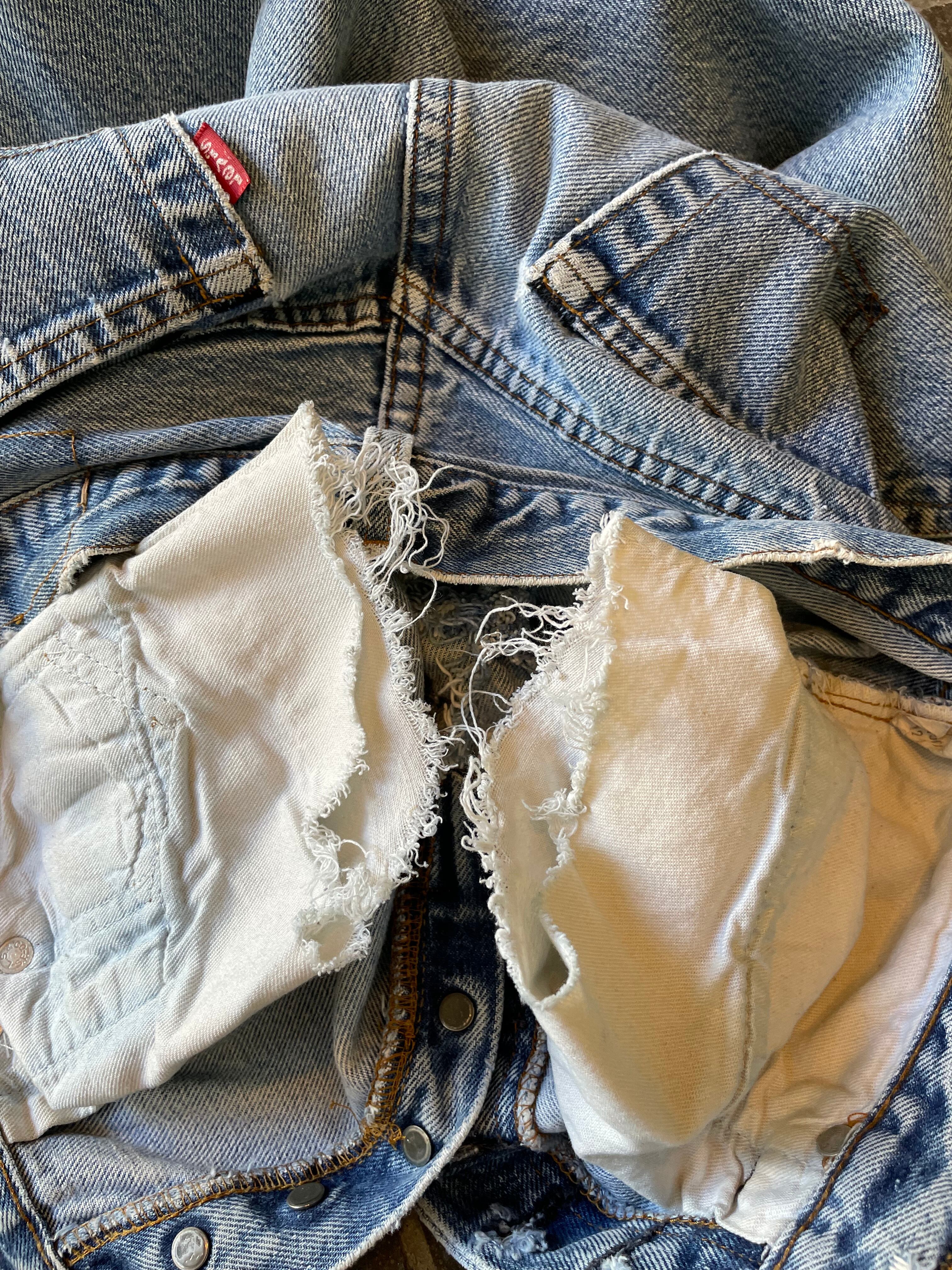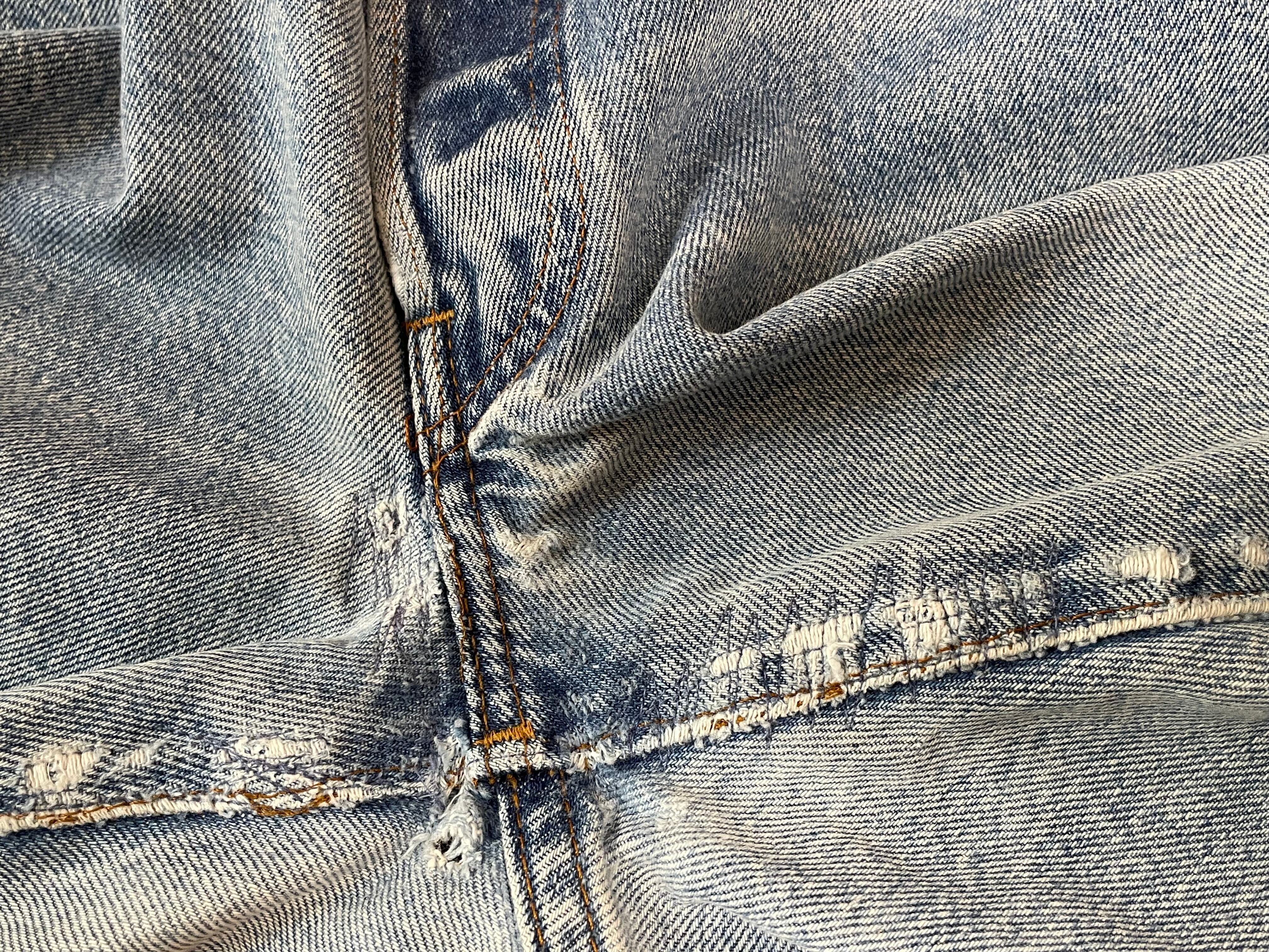 目立った汚れなどは見当たりませんがフロントポケット袋部分に破れ、股部分にリペア、小穴があります。